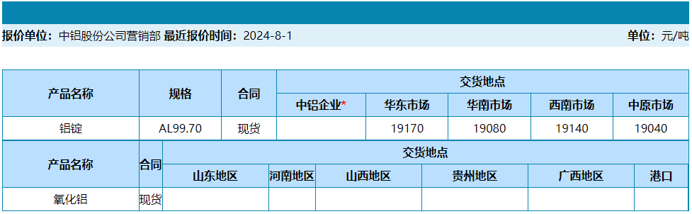 中国铝业2024年8月1日产品报价